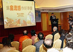 香港醫(yī)院管理局專業(yè)及公共事務(wù)總監(jiān)高永文醫(yī)生,三月二十日在香港舉行“預(yù)防人/禽流感等傳染病”演講會上進(jìn)行演講。 作者:錢興強(qiáng)