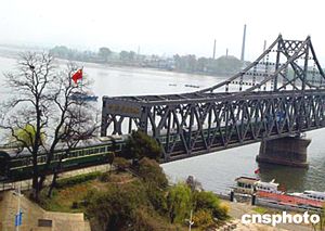 中國丹東一列通往朝鮮平壤的客運(yùn)火車,四二十五日上午通過鴨綠江上的中朝友誼大橋出關(guān)開往平壤。中新社記者:宋吉河
