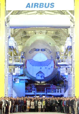 5月7日,在法國(guó)西南部城市圖盧茲空中客車(chē)公司總部,世界上最大的客機(jī)空客A380開(kāi)始總裝。該公司稱(chēng),空客A380將于2005年首飛,2006年投入運(yùn)營(yíng)。