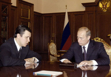 俄羅斯車臣共和國(guó)總統(tǒng)艾哈邁德·卡德羅夫9日在格羅茲尼狄莫納體育館爆炸中身亡后,俄總統(tǒng)普京當(dāng)天下午接見了“火線接任的”車臣代總統(tǒng)謝爾蓋·阿布拉莫夫。圖為普京(右)在克里姆林宮與阿布拉莫夫舉行會(huì)談。