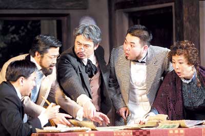 這一次由任鳴導(dǎo)演的《油漆未干》,取得了相當(dāng)好的演出效果。在熱鬧的舞臺(tái)上,觀眾始終能感受到一個(gè)畫家的靈魂,在偉大的藝術(shù)天堂里嘲笑著過去看不起他,現(xiàn)在卻想靠他發(fā)財(cái)?shù)娜藗儭T诮鸱魳窂d里,觀眾不知不覺地和死去的畫家站到了一起,憤怒、鄙視的情緒充斥在劇場里。