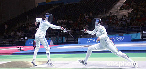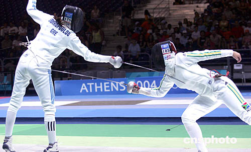 圖為在當(dāng)?shù)貢r(shí)間8月20日舉行的女子擊劍比賽中,希臘選手和南非共和國(guó)選手展開激烈對(duì)攻。