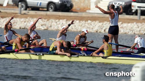 當(dāng)?shù)貢r(shí)間八月二十二日,美國(guó)隊(duì)在雅典奧運(yùn)八人單槳有舵手比賽中得勝,隊(duì)員們到達(dá)終點(diǎn)高唱?jiǎng)P歌。中新社記者:毛建軍