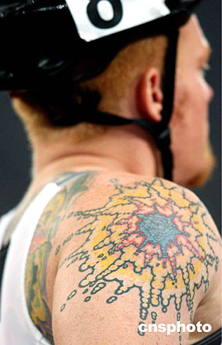 圖為加拿大選手Jeffrey Adams身上的個(gè)性文身特寫(xiě)鏡頭。