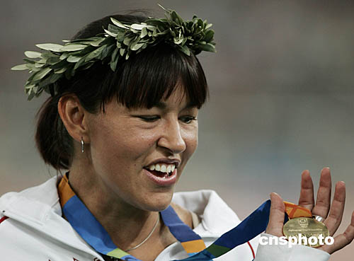 圖為加拿大選手貝蒂克勒克(CHANTAL PETITCLERC)獲得奧運會女子800米輪椅冠軍后展現(xiàn)金牌的鏡頭。