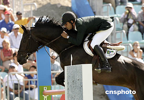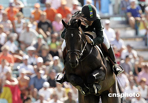 圖為巴西選手Alvaro Miranda Neto在當?shù)貢r間8月24日舉行的男子馬術(shù)團體場地障礙賽中的精彩表現(xiàn)。