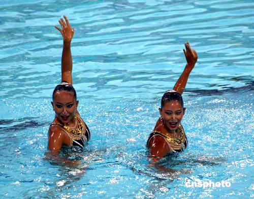 當(dāng)?shù)貢r(shí)間8月24日晚,韓國隊(duì)在雅典奧運(yùn)會(huì)進(jìn)行雙人花樣游泳比賽。中新社記者:王瑤