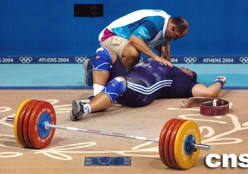 在當(dāng)?shù)貢r(shí)間8月25進(jìn)行的男子舉重比賽中,挪威選手因?yàn)槭д`膝蓋受到傷害,被救護(hù)人員抬上擔(dān)架。