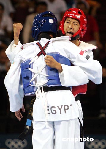 當?shù)貢r間八月二十六日下午,在雅典奧運會男子五十八公斤級跆拳道比賽中,臺北選手朱木炎戰(zhàn)勝埃及選手殺入決賽。中新社記者:毛建軍