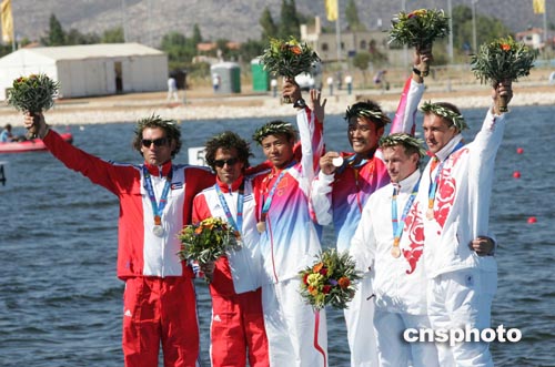 當?shù)貢r間八月二十八日,中國選手孟關良、楊文軍在雅典奧運男子五百米雙人劃艇比賽中奪得金牌。中新社記者:毛建軍