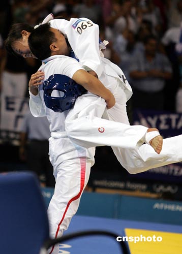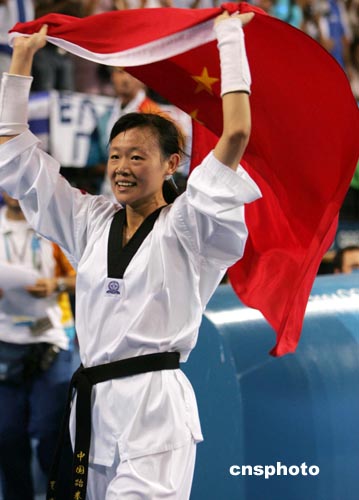 當?shù)貢r間8月28日晚,在雅典奧運會跆拳道女子67公斤級決賽中,中國選手羅微擊敗希臘選手獲得冠軍。中新社記者:任晨鳴