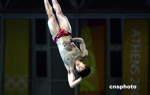 當?shù)貢r間8月28日晚,在雅典奧運會跳水最后一項比賽--10米跳臺決賽中,奪標呼聲最高的“跳水王子”田亮意外失手,僅僅獲得第三名。中新社記者:任晨鳴
