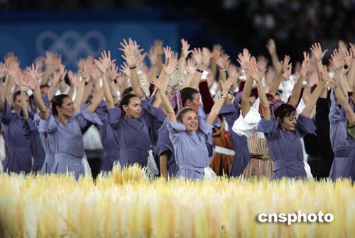 在由四萬五千多片金黃的麥穗裝點(diǎn)的舞臺(tái)上,伴隨希臘傳統(tǒng)音樂和特色民歌,在色彩斑斕的玻璃馬賽克鋪就的道路上,人們翩翩起舞,展示著雅典人收獲的喜悅,表達(dá)他們對(duì)奧運(yùn)會(huì)的祝福。
