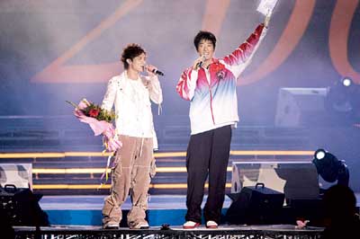 昨晚,相信出現在奧體中心體育場“同一首歌·為奧運喝彩”晚會的觀眾見到的絕對是史無前例的黃金歌手組合。首先出場的是著名歌手孫楠和他的最新搭檔——中國羽毛球隊金牌教練李永波,兩位嗓音同樣出色的大腕演唱的《紅旗飄飄》,贏得滿場喝彩。青春偶像張柏芝當晚的搭檔是萬米長跑奧運冠軍邢慧娜。張柏芝說想親吻一下那塊金牌,邢慧娜俏皮地說:“我沒帶,不過你唱歌給我聽,我就讓你親。”于是,兩人一同演繹了一首《星語心愿》讓大家過了把癮。之后還有孫國慶、李春波、黃鶴祥等歌手和奧運冠軍們演繹的精彩節(jié)目。