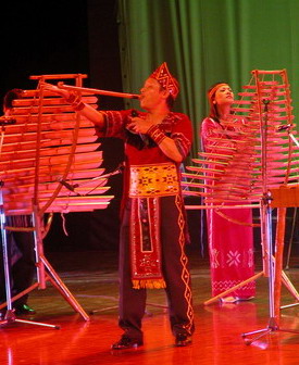 竹制樂器的演奏是越南藝術(shù)表演中獨(dú)具特色的,竹琴據(jù)介紹是仿鋼琴制成的,音色清脆,節(jié)奏明快,表演者的雙手在竹鍵上彈奏,速度快得讓觀眾眼花繚亂;德朗琴是用線將長短不一的竹筒自上而下排掛在一個(gè)琴架上,敲擊琴筒的兩根細(xì)棒頂端各固定一個(gè)圓球,球上罩著一層布,敲擊竹筒時(shí)琴聲似幽谷回響;klong put琴由一排粗細(xì)有別的竹筒制成,演奏者根據(jù)每個(gè)竹筒的固定音調(diào),用手在筒端變換敲擊出舒緩綿長的曲調(diào)來;還有一個(gè)孔的簫,遠(yuǎn)遠(yuǎn)看去吹蕭人將蕭橫托在面前,用手在蕭的遠(yuǎn)端一開一合地掌握音階,仿佛中國蕭從小孔開合變換里發(fā)出的聲音,都從越南吹蕭人的手中魔幻般地變了出來。這些樂器既有獨(dú)奏,又有合奏,兼有表演的觀賞與聽覺的雙重效果,極具藝術(shù)魅力。