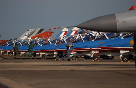 法國空軍的“法蘭西巡邏兵”飛行表演隊正式成立于1964年2月。飛行表演隊的飛機(jī)涂著同法國國旗一樣的紅、白、藍(lán)三種顏色,機(jī)群在空中做飛行表演時也常常把著三種顏色的煙跡留在空中。它象征著“自由”(紅色)、“民主”(白色)、“博愛”(藍(lán)色),體現(xiàn)了法國人民勇敢、浪漫的傳統(tǒng)和對未來美好的愿望。圖為表演結(jié)束后地勤人員正在作例行檢查和維修(來源:艦船知識網(wǎng)絡(luò)版)