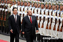 中國國務院總理溫家寶九月十三日下午在北京人民大會堂東門外廣場主持儀式,歡迎來訪的阿爾巴尼亞總理納諾。這是中阿總理三十八年來的首次會晤。中新社記者:毛建軍