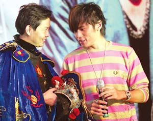 慶功會(huì)以京劇《大鬧天宮》開(kāi)場(chǎng),各路天王把周杰倫簇?fù)碓谥醒耄[喻“唯周杰倫獨(dú)尊”。隨后,川劇大師彭登懷的弟子上臺(tái)伴著《我的地盤(pán)》表演了變臉。站在臺(tái)側(cè)的周杰倫目不轉(zhuǎn)睛地盯著表演者,然后走到表演者身邊左看右看,最后干脆動(dòng)手搜起身來(lái)。聽(tīng)到觀眾的笑聲,周杰倫很不好意思地說(shuō):“等回家再把老師扒光了查!