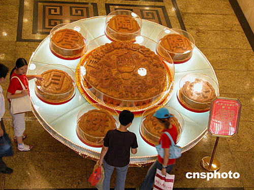 中秋將至,有“月餅泰斗”之稱的廣州陶陶居酒家推出巨無霸月餅“七星伴月”,中間的大月餅直徑達168厘米、重318公斤。作者:劉衛(wèi)勇