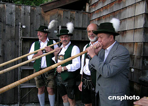 十三日傍晚﹐澳門特首何厚鏵結束了對德國巴伐利亞州一天的參觀訪問后來到阿爾卑斯山腳下游覽﹐當地藝人吹起傳統的阿爾卑斯號角歡迎客人。對長長的號角﹐眾人皆不得其法﹐只有何厚鏵信手拈來即能吹響。作者:孫兆震