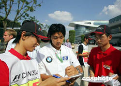 參加F1中國大獎(jiǎng)賽和其他輔助賽的車手,九月二十四日在上海國際賽車場開始練習(xí)。圖為華裔車手董荷斌為車迷簽名。作者:潘索菲