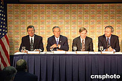 美國(guó)司法部長(zhǎng)阿什克羅夫特、商務(wù)部長(zhǎng)埃文斯、貿(mào)易代表佐立克、國(guó)土安全部副部長(zhǎng)哈欽森(從左到右),十月四日在華盛頓聯(lián)合宣布啟動(dòng)“瞄準(zhǔn)有組織侵權(quán)策略”行動(dòng),將采取更加嚴(yán)厲的措施打擊侵權(quán)盜版。埃文斯稱(chēng),知識(shí)產(chǎn)權(quán)保護(hù)狀況被美國(guó)列為其承認(rèn)中國(guó)市場(chǎng)經(jīng)濟(jì)地位需要討論的重要問(wèn)題之一。作者:余東暉