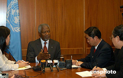 中新網(wǎng)聯(lián)合國10月6日電(記者 陳建)聯(lián)合國秘書長安南有望今秋訪華。美東時間十月六日下午,他在紐約聯(lián)合國總部接受了中國記者的聯(lián)合采訪。安南說,在他的日程表上,有三件事最緊要:法治、改革、發(fā)展。