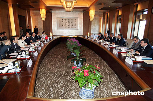 中國外交部長李肇星十月十一日在北京釣魚臺國賓館與來訪的聯合國秘書長安南舉行會談。中新社記者:毛建軍