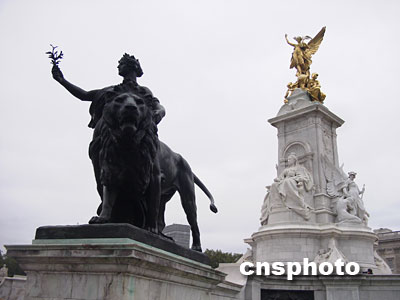英國白金漢宮正面廣場外的維多利亞女王雕像。金色的雕像矗立高端,為手持權杖的天使形象。余瑞冬 攝