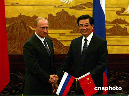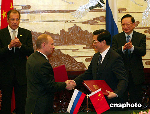 普京完全贊同胡錦濤的看法和建議,他說,發(fā)展俄中合作是俄一貫政策。《俄中睦鄰友好合作條約》為兩國關(guān)系發(fā)展奠定了重要基礎(chǔ),雙方解決邊境問題、就俄加入世貿(mào)組織達成協(xié)議是兩國戰(zhàn)略協(xié)作伙伴關(guān)系的體現(xiàn)。我們愿與中方切實落實該條約的實施綱要,推動雙方在各領(lǐng)域的合作。俄方希望加強經(jīng)貿(mào)合作,爭取在數(shù)量和質(zhì)量上均不斷提高。他重申,俄方關(guān)于同中國的能源合作的決定始終未變,也愿同中國加強在科技、人文等領(lǐng)域的合作。
