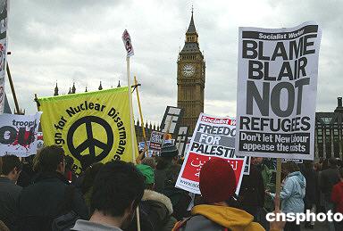 示威者高舉的大型標(biāo)語就不下數(shù)百,其中有“我們要和平,不要戰(zhàn)爭”;“撤回駐軍”;“停止以色列恐怖主義,解放巴勒斯坦”;“打倒工黨帝國主義”“打倒布什”以及“布萊爾必須下臺”等等。