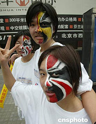 金秋十月,三位涂著京劇臉譜的北京工商大學(xué)女學(xué)生參加社會(huì)活動(dòng)。中新社記者:史利
