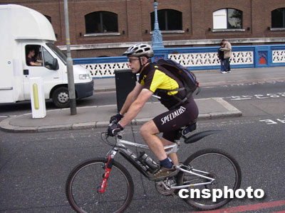 倫敦狹窄的馬路常常并不劃出專門的自行車道,即使有,只是用白線隔出的一條僅容一輛自行車騎行的細(xì)徑。也許是得益于這里良好的交通秩序和公眾的交通意識,人們騎車的速度一般都很快,堪稱“飆車”,雖然沒見到誰出現(xiàn)閃失,但其速度也令記者們暗暗捏一把汗。