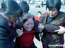 圖:大平礦難家屬在礦難現(xiàn)場外悲痛欲絕