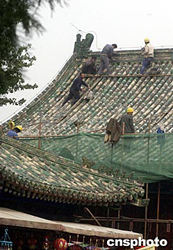 十月二十九日,京城皇家祭壇——地壇啟動有史以來規(guī)模最大、最完整的一次古建筑文物修繕工程。整個工程修繕面積達一萬九千八百平米,耗資四百余萬元人民幣,預(yù)計于二零零六年夏天完工。圖為建筑工人們在宰牲亭的屋頂局部進行修整。作者:韓藝冰