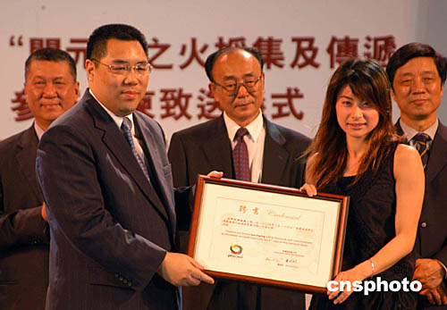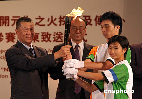 澳門特首何厚鏵在金蓮花廣埸接過中國雅典奧運金牌得主勞麗詩和澳門運動員李廣祥傳遞的“開元”之火火炬