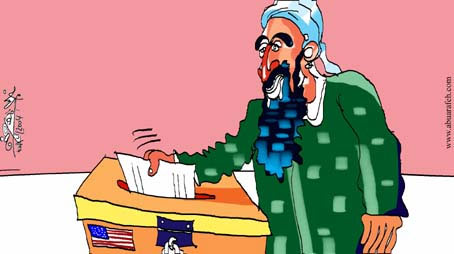 | 中新網(wǎng)11月1日電 10月29日晚,銷(xiāo)聲匿跡一年多的本拉登,在美國(guó)大選投票日來(lái)臨的前四天突然拋頭露面了。在半島電視臺(tái)播放了本拉登講話(huà)的錄像帶之后,分析家一致認(rèn)為拉登此次露面是為了給美國(guó)大選施加影響,試圖影響美國(guó)大選的最終結(jié)果。半島電視臺(tái)網(wǎng)站于今日發(fā)表了一幅漫畫(huà),在這幅漫畫(huà)當(dāng)中,本拉登被描繪成一個(gè)重量級(jí)選民,他的講話(huà)被戲稱(chēng)作是在為美國(guó)總統(tǒng)大選提前投票。(章田)