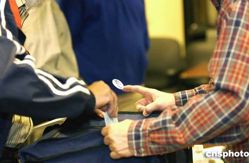 二○○四年大選中已經(jīng)全面引用先進(jìn)的電腦屏觸式投票機(jī)進(jìn)行選舉。但仍有選民偏愛紙票。圖為美西時間十一月二日上午,選民把選票投進(jìn)型似藍(lán)布旅行包的大選票箱的情景。作者:陳鋼