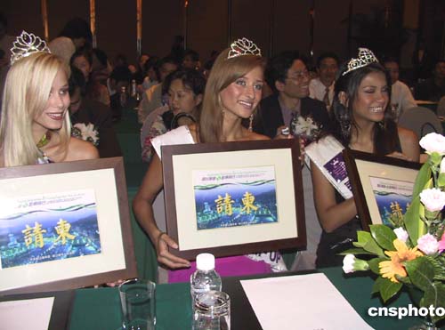 二零零五年國際旅游小姐冠軍總決賽中國四川賽區(qū)大賽啟動儀式十一月四日在成都舉行。二零零四國際旅游小姐大賽冠軍(中)、亞軍(左)以及獲得第五名的斯洛伐克小姐(右)為啟動儀式助興。作者:張華