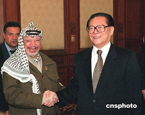 資料照片:江澤民會(huì)見(jiàn)阿拉法特