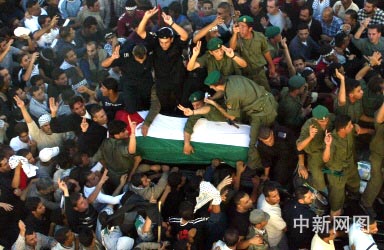 在約旦河西岸和加沙地區(qū)的建筑物和汽車擋風玻璃上都貼滿了阿拉法特的照片,人們揮舞著黑白頭巾,這兩個顏色是這位已故領(lǐng)導人所領(lǐng)導的“法塔赫”運動的象征。阿拉法特生前一直戴著這樣黑白相間的頭巾。