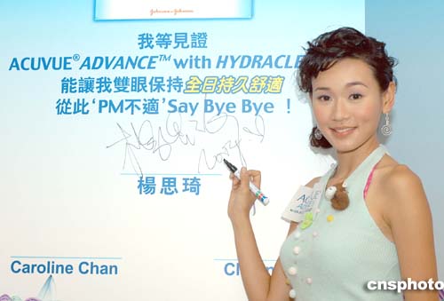 藝員楊思琦11月15日在香港出席全新ACUVUE隱形眼鏡新聞發(fā)布會(huì),楊思琦試用產(chǎn)品后,見證簽名推介。作者:鄧慶樂