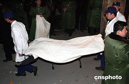 二零零四年十一月二十一日晚,經(jīng)過(guò)連續(xù)搜索搶救,河北省邢臺(tái)市沙河礦難死亡人數(shù)又有所增加,又有十多名礦工的遺體被抬出金鼎鐵礦巷口。中新社記者:武仲林