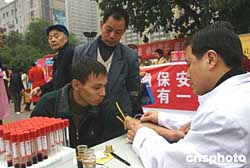 重慶市傳染病醫(yī)院的醫(yī)療人員上街免費為市民抽血檢測HIV病毒。作者:郭晉嘉