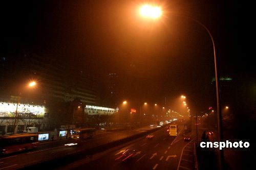 中新社北京十二月二日電(記者周音)自十二月一日至今晨的濃霧侵襲著中國大部分地區(qū),致使中國許多地區(qū)機場飛機航班延誤,上萬名旅客滯留機場。高速公路封閉;汽車在濃霧中緩慢前行。