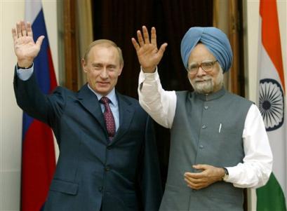 在3日普京與印度總理辛格的會晤后,雙方舉行了聯(lián)合新聞發(fā)布會。普京表示,俄羅斯將支持印度躋身聯(lián)合國安理會常任理事國行列,稱對此將不會行使一票否決權;辛格則表示,印度全力支持俄羅斯加入世貿(mào)組織,稱俄為世貿(mào)148個成員國以外最大的經(jīng)濟體。