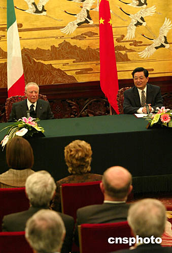 圖:胡錦濤與意大利總統(tǒng)錢皮共同會(huì)見記者