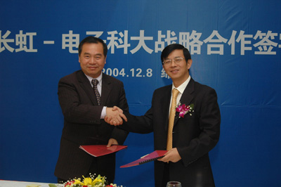 中新四川網(wǎng)12月8日電(陳紅)四川長(zhǎng)虹電器股份有限公司董事長(zhǎng)趙勇和成都電子科技大學(xué)校長(zhǎng)鄒壽彬,今天分別代表雙方,為醞釀已久的長(zhǎng)虹成都電子科大校企聯(lián)姻發(fā)展戰(zhàn)略簽約定音。