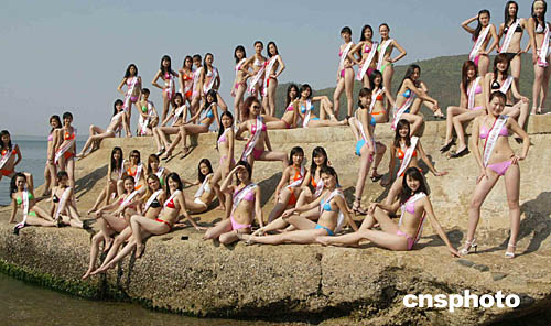 來(lái)自中國(guó)各地的六十二位參加第十七屆世界模特小姐大賽中國(guó)賽區(qū)總決賽的選手,日前來(lái)到深圳風(fēng)景秀麗的海邊,身穿泳裝展示風(fēng)采。中新社記者:錢興強(qiáng)