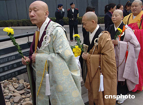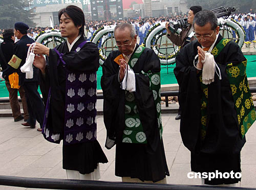 日本東鐵路工會(huì)、日本佛教徒和平訪問團(tuán)等日本和平友好人士參加了今天的悼念活動(dòng)。并在會(huì)場(chǎng)上打出了“我們決不忘記南京大屠殺的事實(shí)”、“反對(duì)日本向海外派兵”等橫幅標(biāo)語。